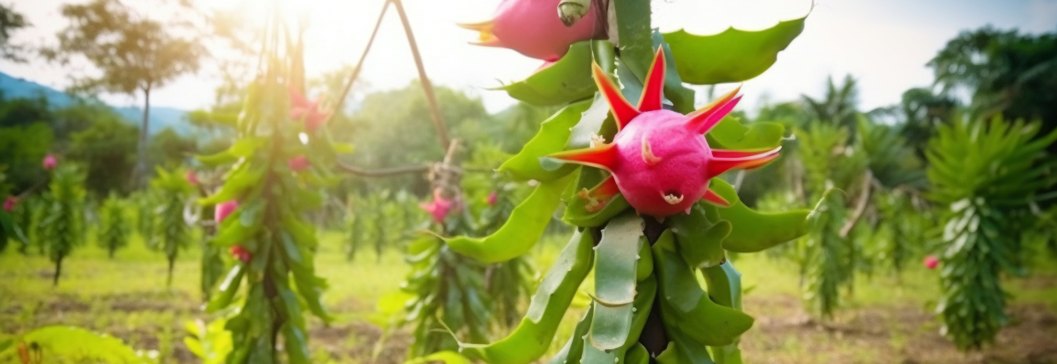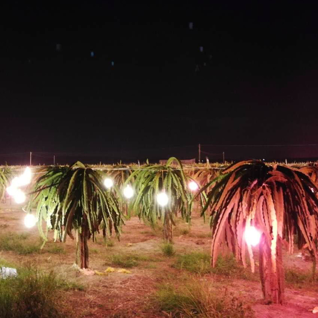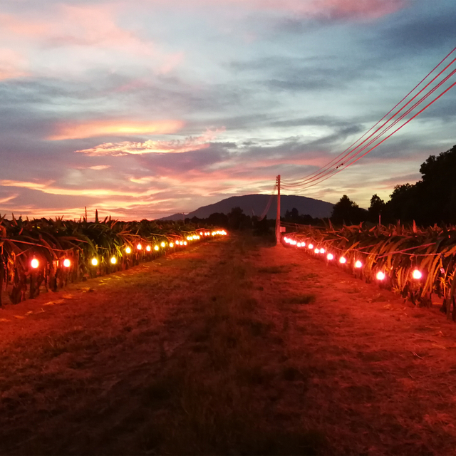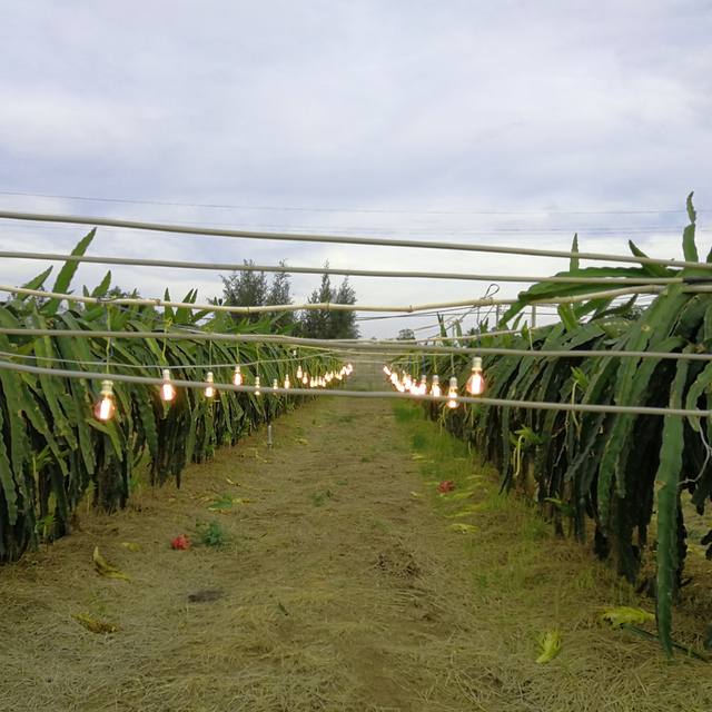 为了提高火龙果的开花频率,延长其产期,并实现火龙果的错峰上市,从而在市场销售和价格方面获得优势,广明源为越南潘切市的火龙果种植基地设计了一套火龙果人工补光解决方案。该方案采用了专业且高效的催花光谱技术,通过花期灯对火龙果进行人工补光促使其开花,以提升火龙果的年产量。