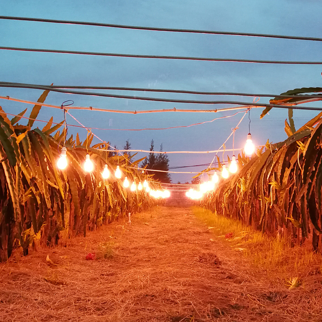 为了提高火龙果的开花频率,延长其产期,并实现火龙果的错峰上市,从而在市场销售和价格方面获得优势,广明源为越南潘切市的火龙果种植基地设计了一套火龙果人工补光解决方案。该方案采用了专业且高效的催花光谱技术,通过花期灯对火龙果进行人工补光促使其开花,以提升火龙果的年产量。